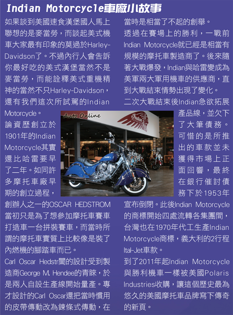 ![]() 前幾期我們所試駕的勝利機車在美國與Indian Motorcycle皆屬於北極星集團的一員。因此台灣總代理海德生貿易繼導入勝利機車後第二波引進給車迷朋友的作品就是有擁有超過百年歷史的Indian Motorcycle。