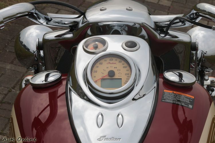 美式風格 日式細膩的引擎動力![]() ▲Thunder Stroke 111引擎維持OHV大扭力輸出的特性,採49度夾角讓車輛更精壯。Indian的三款車型皆使用新研發的Thunderstroke 111引擎,V型雙缸排氣量高達1811cc。 ![]() ▲即便排氣量來到1811c.c,但Chieftain在檔位銜接以及油門控制上都相當好上手。![]() ▲Chief Classic的儀表就整合油桶上,在視覺上其實不是很直接,但也無傷大雅就是了。![]() ▲看似壯碩的身型其實滿是細膩的設計,無論是操控面或是工藝面。