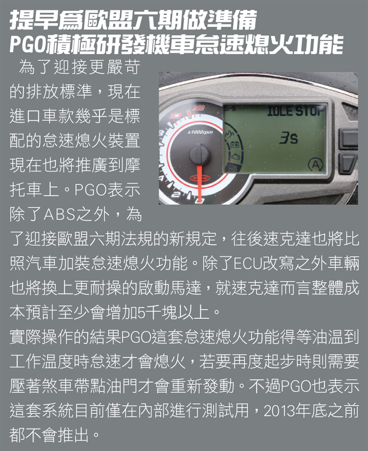 而同樣是國人自製的PGO也如同LUXGEN般,在配備上領先同業,成為第一家在國產速克達中導入ABS煞車系統的業者,值得鼓勵。但誠實而論,在品管穩定度或是改裝配件的豐富程度PGO還有更精進的空間。