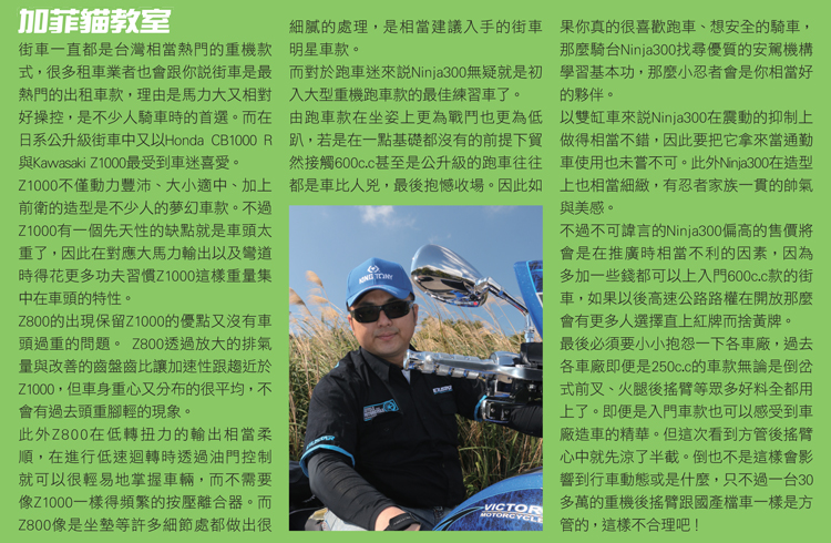 很多人在初接觸重機時常見的問題不外乎是該騎跑車還還是街車?應該先從黃牌開始還是直上紅牌?新手挑戰公升級車款會不會有危險?面對眾多問題Kawasaki提出一個相當不錯的解決方案,讓喜歡街車與跑車的人都能找到適合自己的車款,而且馬力也算適中,它就是今天我們所要試駕的Z800與Ninja300。