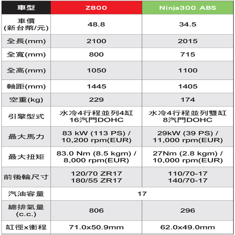 後來Kawasaki針對旗下兩台車款進行排氣量放大的動作,雖然在都是在過去機種上所做的修正,但Z800舉凡造型與操控性都有相當大幅度的翻新,可用嶄新級距的眼光來看待。而正式掛上黃牌的Ninja300則成為想要體驗忍者跑車系列魅力的不二首選。