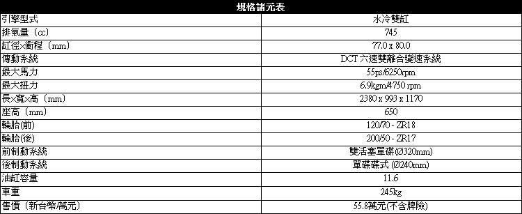 這DCT雙離合變速箱換檔的銜接的順暢度是OK的,但沒有讓我們有眼睛為之一亮的程度,當然我們這樣的評價是以高標的汽車角度來檢視,如汽車般那樣幾毫秒的換檔速度在兩輪的雙離合變速箱是看不到的!不過機車用這樣的變速箱有個好處就是速克達車款也會有檔煞的效果,對於山路騎乘在前彎前配速就不需要過份的依賴煞車,騎起來會更加輕鬆。