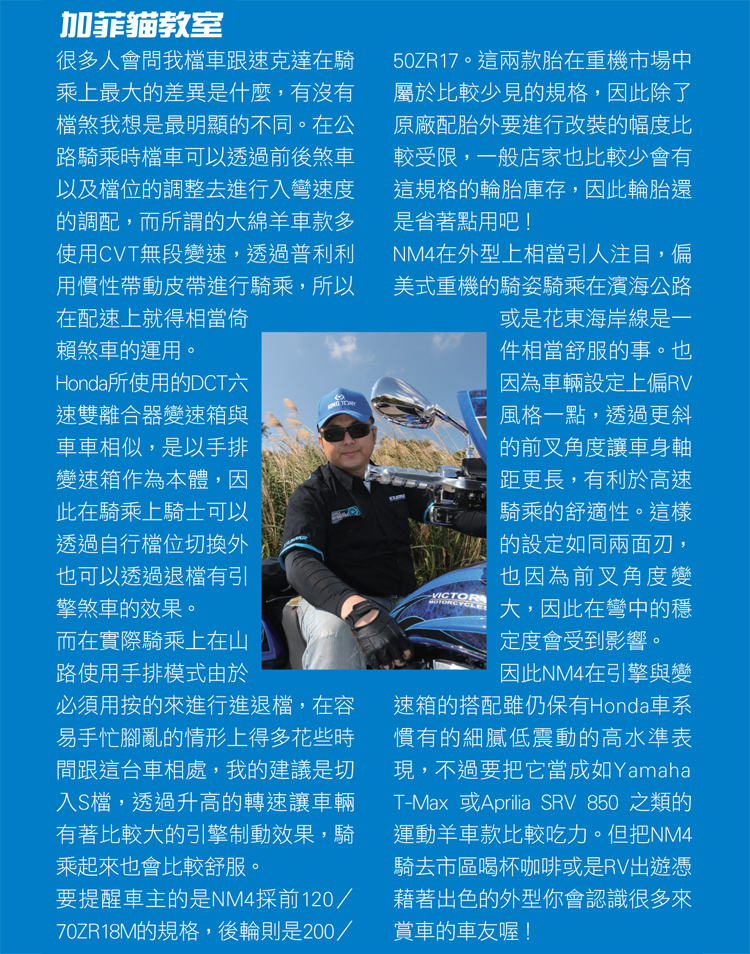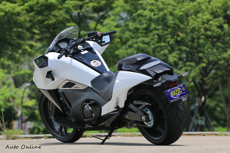 在外觀設定上這車其實蠻有美式機車味道,無論是前蹬式的騎乘姿勢、寬大的車頭造型、與後土除合而為一的車尾設計,蠻多地方都有著美式重機經典元素在。在車尾部分NM4字樣也直接刻在車殼上,對日系車來說這倒是比較少見的做法。也許受限於成本考量,車上大多是塑膠件,如果可以換上如CNC的金屬件相信會更有狂野的動感喔。