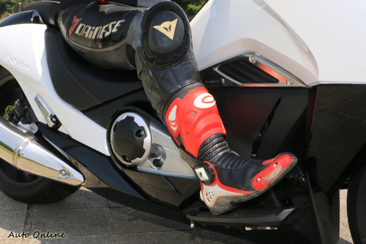 另一項可以證實NM4是一台偏舒適騎乘的證據是它的配胎,除前輪升級到18吋的尺碼外,後輪胎寬更來到200mm。如果與Integra相比你會發現原本一整條的腳踏位置縮小約莫一半的長度,位置也更往車頭移動。這樣的改變讓騎士要利用雙腳固定上半身時會比較吃力,你無法如騎乘其他運動羊的車款般用腳去夾緊車身龍骨。