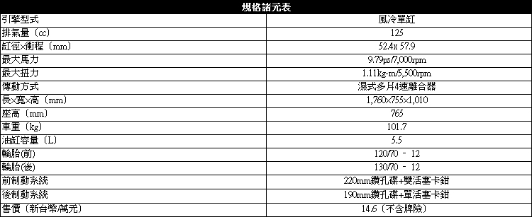 車輛最大馬力為9.79ps,在國外是可以上高速公路的。台灣雖然連騎高架橋都不行,但至少它的動力表現不需過度擔心。此外由於車輛採12吋配胎,市面上輪胎種類花樣眾多好買,加上檔車設定因此過彎做傾角相當靈活,你不需要擔心會像騎速克達一樣敲到中柱或磨到傳動蓋,山路玩樂度超高!