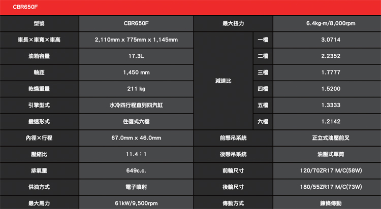 ![]() ▲新四缸的魅力!看起來是跑車無誤,騎起來沒那麼累,可趴可輕鬆。綿密的四缸輸出不管是街道或拼山道都很適合跑車入門者。第四名CBR650F 入門四缸跑車起點 售價:45.6萬元 我個人曾擁有2003年式的CB400SF VTEC Spec II,也就是那台本田的「黃牌小神車」,可惜賣掉後不久黃牌路權開放,價格暴漲買不回來。本田的四缸引擎綿密聲浪真的很讚,當時買CB400中古車就是為了一圓小時候的夢想,然而小排氣量的四缸在低轉速實在很不行,6300rpm才開啟VTEC,綠燈起步先被125cc小綿羊巴假的,拉高轉聲浪高亢才能超過小綿羊。賣掉有些後悔,但我再也不想騎小排量的四缸車了。![]() ▲左側看不到四缸的排氣管,鋁合金後懸臂仍非常亮眼。後移的踏板可做出更大的傾角,雖不是RR等級,會騎的在北宜非常威猛。
