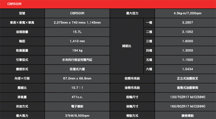 ![]() ▲CBR500R~帥氣又好騎的黃牌檔車,雙缸扭力便利通勤,外觀比照CBR1000RR的雙燈Fire Blade整流罩,要我能回溯大學時光,一定騎這台!第五名CBR500R 雙缸低轉高扭 拉風好騎 售價:36萬元 如果你只想要一台超拉風的通勤檔車,這部CBR500R絕對是容易入門的黃牌好車。比較窄的輕量車體與油箱,卻有RR系列的雙頭燈以及簡潔帥氣的Fire Blade整流罩,騎起來和街車一樣簡單舒服。雙缸低轉速高扭力的特性,起步非常容易,輕鬆放個離合器就前進,容錯率很高。雖然是雙缸,聲浪聽起來相當低沉渾厚,幾乎沒有不適的抖動感,就算是高速行駛也不會手麻。![]() ▲分離式前後坐墊、漂亮的車體、剛好夠用的配置,騎起來、保養起來都很OK,極速可達190km/h,夠厲害了啦!