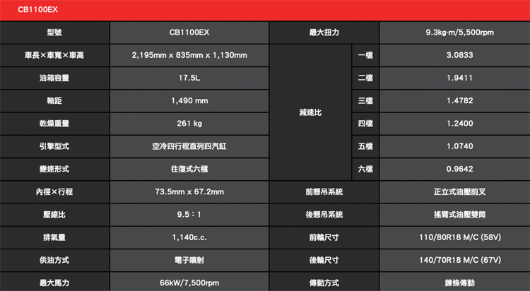 個人在濱海的騎乘經驗,四檔兩千多轉就已經足以順暢全程巡航,三檔拉轉速非常過癮,不小心就超過140km/h,此時風壓也差不多令人受不了。這部車不是騎快的,是騎一個經典,騎一個全速域都暢快的爽感! 台灣本田引進的CB1100EX版選用無內胎的鋼絲圈,這讓毒性放大十倍。比較重、雙管比較寬,有中柱,這車真的經典到無敵!我如果買了這台,就不會想賣掉,也沒機會換車了。(這是唯一的缺點)