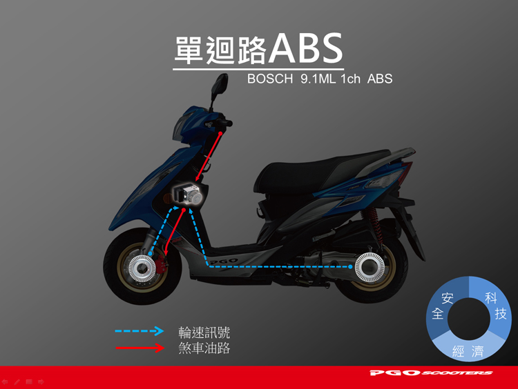 或許你會跟我有同樣的疑問,為什麼PGO不乾脆就讓BON 125 ABS 使用前後雙碟煞的配置,而是選擇使用單迴路ABS系統?這問題其實從定價策略上面就可以看出端倪,因為BON 125 ABS走的是平價路線,如果換成前後雙碟加上ABS系統的配置,在成本提高的情況下勢必會反映在價格上,再加上BON 125本來就是前碟後鼓的煞車配置,原廠自然就會朝這個方向去升級安全配備。不過話說回來,單迴路系統雖然無法完全防止後輪鎖死,但是在正常的情況下,前輪鎖死的危險性比後輪高出許多,因此使用單迴路ABS系統還是會比完全沒有來得安全。