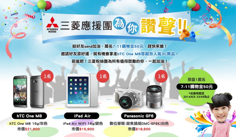 ![]() 還有機會成為”超級讚神”,拿走超夯人氣3C獎品,包括最熱門的hTC One M8智慧型手機、人氣平板iPad air、Panasonic女朋友機 GF6等,邀請越多好友就有越多中獎機會!這麼好康還不趕快加入「三菱Mitsubishi Motors Taiwan」官方粉絲團。