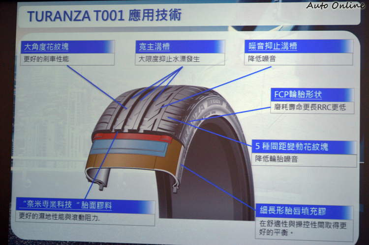 ▲T001的六項主要技術中,降低噪音的溝槽與奈米專業科技的胎面膠料是關鍵所在。