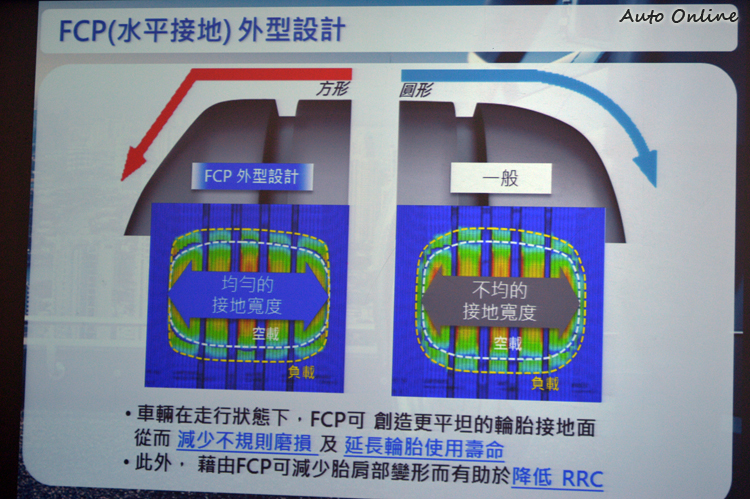 FCP胎形將原本圓弧形的外緣更大幅度銳角化,讓胎面有更大範圍的觸地面積,達成更有效的平均摩擦性,以減少不規則磨損並延長輪胎壽命,也有助於降低RRC(Rolling Resistance Coefficient)滾動阻力係數。