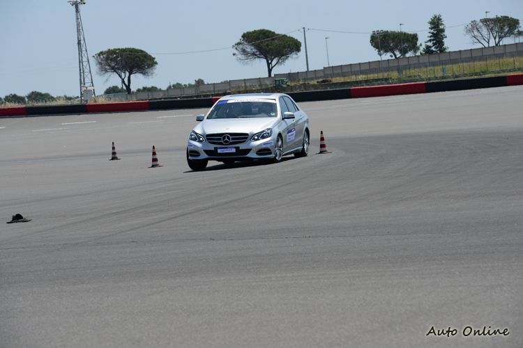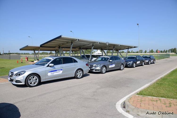 第二天整天的行程都在測試場進行,三部E-Class各搭載新的T001、GR90以及M牌競爭產品,輪流行駛於周圍的模擬道路,比較三款胎的舒適與靜肅性,沒想到新的T001真的明顯地比舊款GR90與M牌產品安靜許多,經過不平路面的吸震能力也有明顯差異。