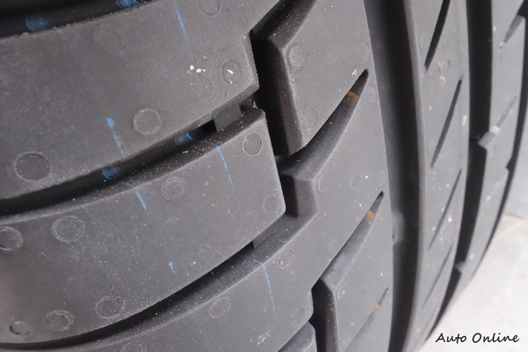▲胎紋設計上的特殊角度不對稱溝槽,以及胎塊的互鎖設計結構,都是為了提供更強大的操控穩定性。