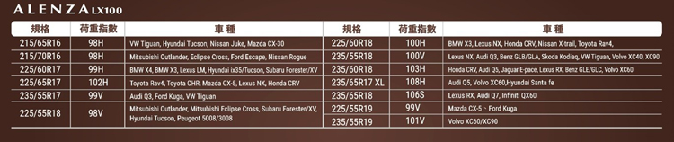 專為SUV開發之靜音技術![]() 為達到符合頂級SUV水準的舒適性,日本普利司通輪胎特別為其開發多項竟因技術,包含即在輪胎磨損後也能持續抑制高頻噪音的「隱藏式噪音抑制溝槽設計」、可以實現更高層次靜肅性的「3D噪音抑制溝槽」、輪胎內側專屬「3D降噪音設計」、減少載重後左搖右晃程度的「SUV專用之胎邊結構設計」等多項先進科技運用,達到與裝載車輛相輔相成的出色寧靜度。ALENZA LX100針對主流與高階SUV設計,尺寸從16吋到19吋,共有13種規格,適合SUV市場主流品牌與車型。