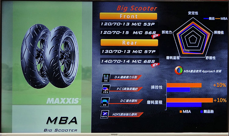 至於本次新推出的MA-MBA輕型大型速克達胎,也是MIT PRO TEAM 挑戰美國鹽湖賽道,一舉創下突破 206 km/hr 全新 紀錄所指定使用輪胎,足以證明輪胎具備足以應付嚴苛環境的高品質。MA-MBA導入先進複合材質,較市面上競品擁有更優異的操控性和耐磨耗表現,前胎提供120/70之13吋和15吋胎,後胎則提供130/70-13和140/70-14兩種規格。