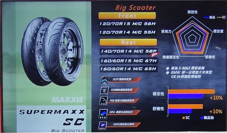 MA-SC則是專為大羊車型所設計的輪胎,也是 BMW 第一台電動機車 CE 04 新車配備輪胎。產品具備:雙膠料配置、鋼絲纏繞緩衝層、漸進式纏繞緩衝層、最適化胎型設計和濕地強化膠料,等五大技術優勢,提供卓越抓地力與耐用性。