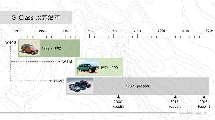 G的名號源於德文「Gelandewagen」(越野車),擁有淵遠流長的熱血基因與賽場驕傲,自上世紀70年代在伊朗末代國王巴勒維的催生下誕生後,G-Class隨即從軍事功能導向轉而成為消費市場搶手的越野車,方正的線條刻劃結合強悍的越野性能,從此成為這個車系最引以為豪的註冊商標。而今正當世人已逐漸淡忘SUV實為越野而生,在各家車廠屈服潮流不再製造硬派越野車,Mercedes-Benz卻依然堅持保留G-Class的經典運動性格,持續為多功能越野車款發展歷程刻劃不可抹滅的史詩。