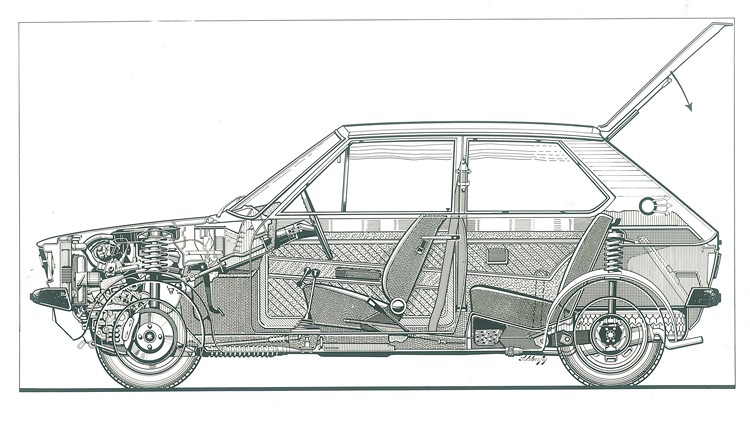 Ludwig Kraus只為這款車設定一個簡單但很重要的目標:「尺寸必須符合民生用車需求。」為了開發出擁有更大內部空間的車,工程師選擇採用較不佔用空間的橫置引擎配置,這個決定後來證明就是小型車得以成功的重要關鍵。