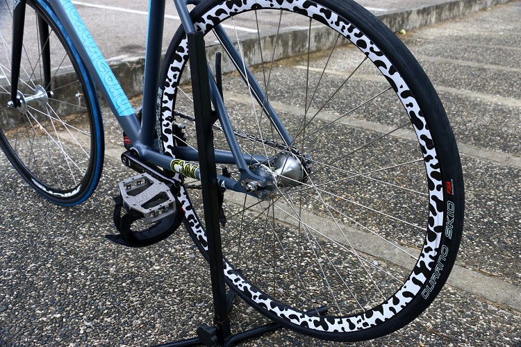 個人品味的表達-Fixed Gear![]() ▲單速車的配色更能表達出個人品味。Fixed Gear單速車從車名可看出端倪,顧名思義就是只有單個齒盤,不像普遍公路車或者越野車有換檔機構,大盤與小盤配好齒比,上坡、下坡與平路都使用同樣齒比騎乘。單速車的煞車方法不像傳統腳踏車,使用手拉式煞車,單速車後齒盤為固定式,所以踏板往前輪胎往前,踏板往後輪胎往後,如果將踏踏板停下,輪胎就會停止,單速車想要煞車就必須用作用力將踏板向後蹬,這時就呈現車輛後輪鎖死,類似甩尾的動作使車停止。 ![]() ▲輪組為義大利製Miche品牌。![]() ▲單速車顧名思義只有一組齒盤,固定的齒比要應付上坡、下坡、平路。車架 BB17 Karma 前叉 BB17 Tapered Carbon Track 手把 FSA Wing Pro Compact 龍頭 Cinelli Vai 大盤腿組 Miche Primato Advanced Pista 49T 鍊條 Shimano NX01 輪組 Miche Pistard WR Wheels 踏板 IRB BMX Pedals 狗嘴套 Cinelli Kinks Straps 椅墊 Cinelli CMX 座管 Miche Supertype