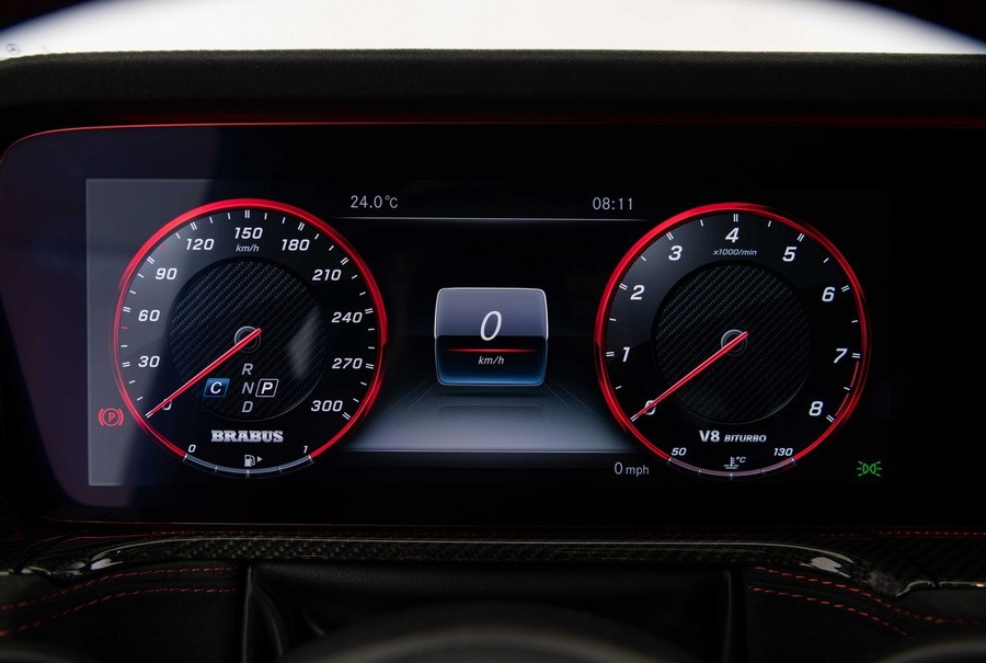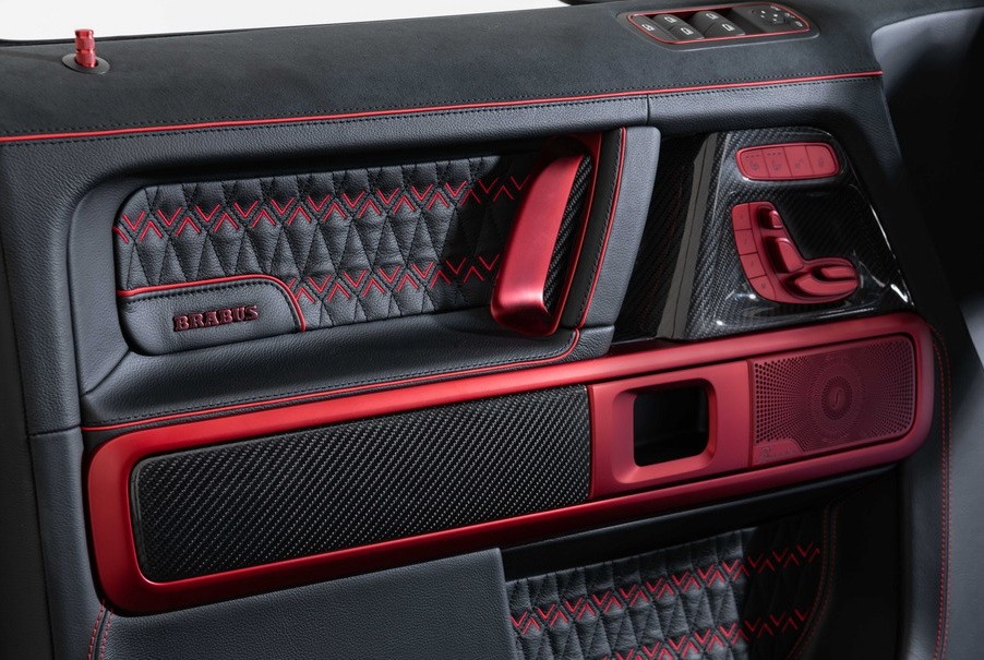 車內在座椅與車門內側處以菱形衍縫的黑色皮革包覆,內裝飾板採用高亮碳纖材質,腳踏板與車門鎖紐為鋁合金材質。不鏽鋼登車踏板上的BRABUS廠徽有背光照明。後座改為兩張獨立的桶椅,具有位置記憶、通風與電熱等機能。