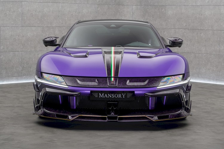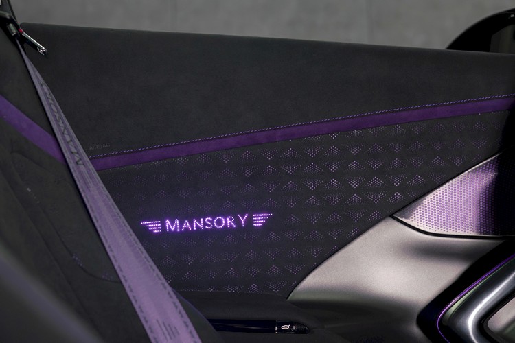 就跟其他MANSORY整車改裝一樣,內裝可依客戶需求完全客製化,包含皮革、色彩、縫線與碳纖維樣式。發表車款內裝以灰色Alcantara為主體,搭配紫色飾件。頂篷同樣以Alcantara包覆,並嵌入多組LED光源與紫色發光 MANSORY Logo。