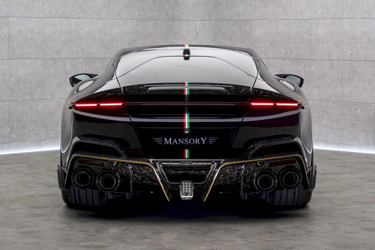 引擎蓋同樣為全碳纖維材質並延伸至輪拱散熱孔與前葉子板後段。從側面觀察可見全車輪拱外擴與顯眼的側裙,皆以裸露碳纖維打造,展現強烈的 MANSORY 簽名風格。車尾則維持優雅無尾翼設計,但換上整塊全碳纖維後保桿,內建第三煞車燈,營造更具侵略性與辨識度的視覺效果。車身中央還加入了義大利國旗「Tricolore」條紋貫穿全車。《MANSORY Equestre》提供Coupé硬頂與Spider敞篷兩種版本。