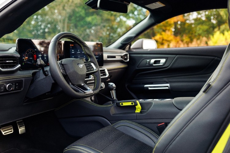 內裝部分,超亮萊姆綠主題延續到儀表板、中控台、門板置物袋和甩尾手煞車的對比縫線。標準的內裝飾面和飾條可免費選配,但當車主打開車門或啟動引擎時,螢幕會顯示 RTR 專屬圖形。Mustang EcoBoost RTR套件車預計明年夏天才會開始交車。