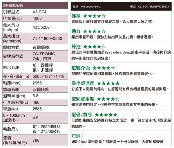 他的強悍我們拿個對手來比,E 63 AMG Estate同樣兩噸多的車重,但CL 500雖然更大台,但0~100km/h的加速也比E 63 AMG Estate的4.6秒慢上0.2秒而已,CL 500的扭力峰值還大上7.14kgm。