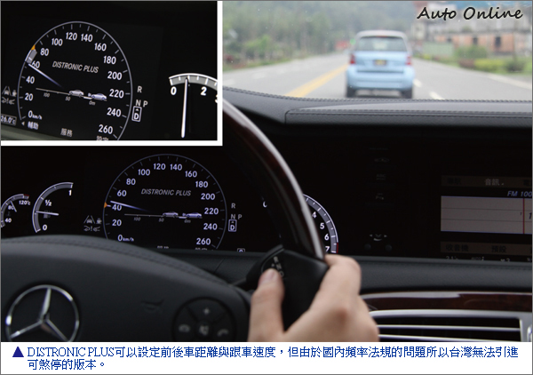 最後壓軸的有趣設備則是名為DISTRONIC PLUS的車距控制系統。這個系統在賓士集團中其實發展一段時間了。在賓士2008年於ARTC所舉辦的安駕營時就展現一台裝載DISTRONIC PLUS的S500。在那個時候其實這套DISTRONIC PLUS就已經可以做到跟車煞停的程度了,不過台灣車迷則是無緣體驗到這項科技。
