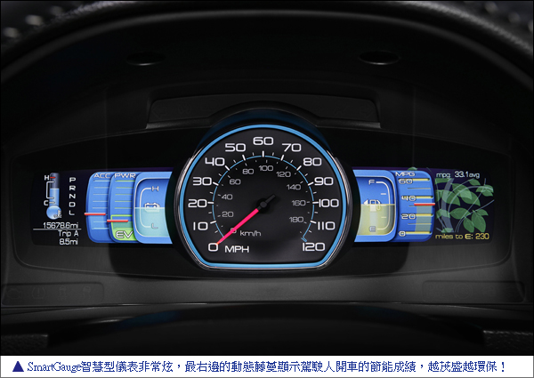 在純電動的模式下,Fusion Hybrid可以每小時75公里的時速行駛,幾乎是其他競爭對手的兩倍,更能達到都會區的行駛要求,也造就都會區比高速行駛更省油的超實用表現。為使駕駛人自我精進節能行駛技術所開發的EcoGuide經濟行駛指導裝置與SmartGauge智慧型儀表系統,提供駕駛者與Hybrid系統的互動體驗。時速表兩側各一彩色液晶顯示幕,可顯示燃油和電池電量的使用情況、平均油耗、即時油耗等,當車主駕駛時的燃油經濟性越高,動態藤蔓顯示的綠葉就越發茂盛美麗!每天在節能駕駛互動中獲得直接的視覺回饋並熟練節能行駛的技巧。