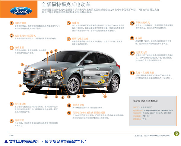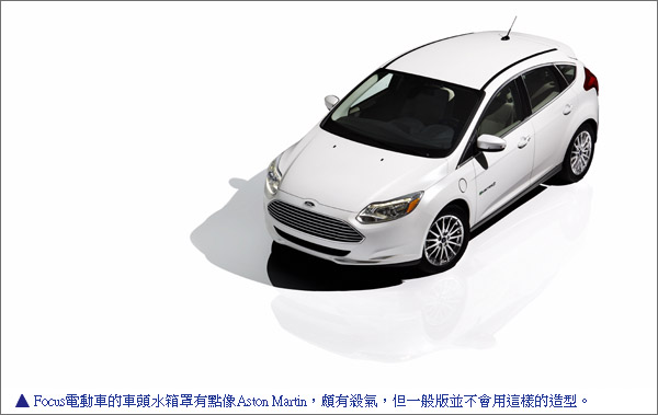 福克斯(Focus)電動車是福特首款零油耗、零排放、可充電式乘用車,其先進的動力總成系統確保車輛卓越的效能優勢,並絲毫不減車輛原本的駕駛樂趣。使用家中的240V電源進行完全充電僅需不到四小時,最高車速可達136km/h,行駛里程可達160公里。