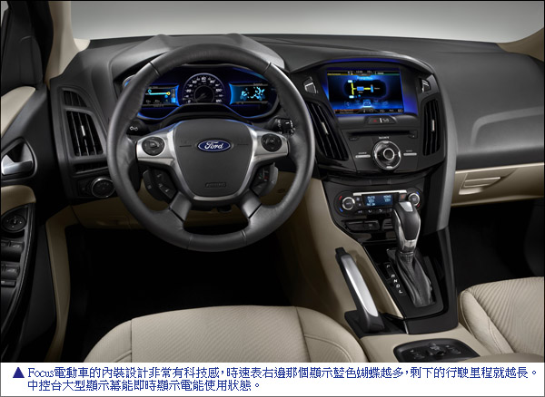 正如福特在北美車型福特Fusion混合動力車上搭載的第一代SmartGauge儀錶及EcoGuide系統使用動態藤蔓設計來體現的燃油效率,福克斯電動車的儀錶顯示採用了藍色蝴蝶的設計來代表到達最近充電點時的剩餘的可行駛里程——藍色蝴蝶越多,可用里程越多。福特設計師們的靈感來自於「蝴蝶效應」現象,即小變化能帶來大影響,正如選擇駕駛電動車所能夠帶來的巨大影響。為強調這一理念,在每一段行程結束時,顯示幕都會顯示已行駛距離、通過制動再生電力所行駛的里程、能耗以及因駕駛電動車而節省的汽油量。