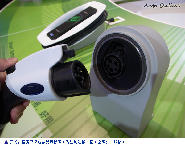福特汽車與供應商YAZAKI公司合作推出的業界標準五芯式插頭,設計符合人體工學,握持感舒適且耐用度高,充電操作非常便利。充電口位於駕駛座側車門和前輪之間,當充電插頭插入充電口時,充電口周圍的光圈即被啟動,並環繞閃耀兩圈以確認連接,接著以九十度弧線依次熄滅。充電過程中,閃爍的九十度弧代表正在充電的部份,已亮起的部份代表充電完畢,當整個光圈亮起時,代表車輛的電池已充滿。整個充電系統操作簡便並且一目瞭然。