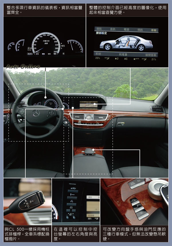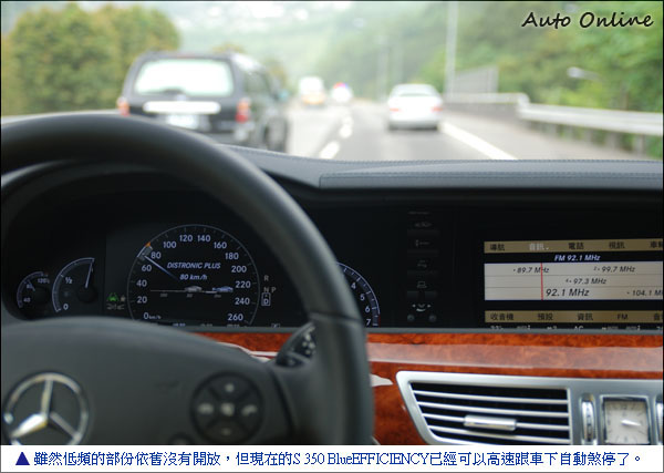 因此整體內裝配備的水準與模樣其實跟之前所試駕的CL 500 BlueEFFICIENCY相當接近,只不過S 350 BlueEFFICIENCY並不適用ABC主動車身控制系統。不過在S 350 BlueEFFICIENCY還是有一項相當有趣的配備那就是DISTRONIC PLUS的車距控制系統。