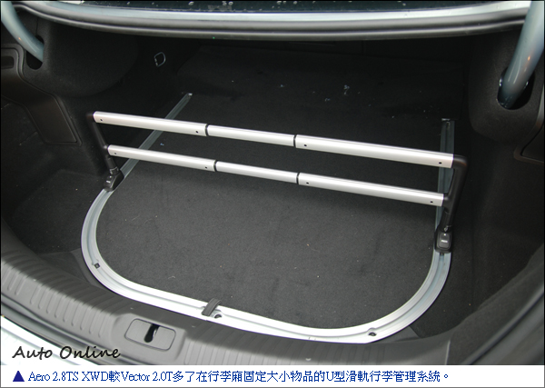 在內裝上,與Vector 2.0T最主要的差別就是增加可投影在前檔玻璃上,類似戰鬥機顯示重要資訊的HUD抬頭顯示器,以及增顯豪華貴氣的全景式玻璃天窗。在行李廂,Aero 2.0T FWD和Aero 2.8TS XWD也較Vector 2.0T多了在行李廂固定大小物品的U型滑軌行李管理系統。