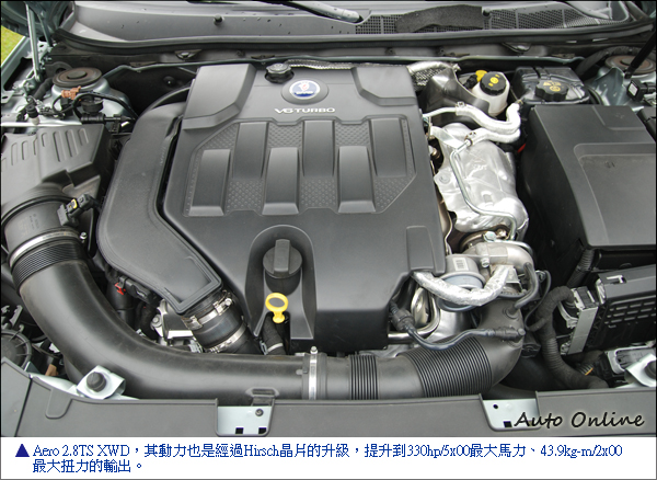 而國內引進的Aero 2.8TS XWD,其動力也是經過Hirsch晶片的升級,動力輸出從原來的300hp馬力、40kg-m扭力,提升到330hp/5x00最大馬力、43.9kg-m/2x00最大扭力的輸出。經過Hirsch的加持,Aero 2.0T 0~100km/h的加速成績為7.8秒,極速可達到250km/h;另外,Aero 2.8TS XWD的0~100km/h加速成績為6.1秒,極速則可達到260km/h的境界。