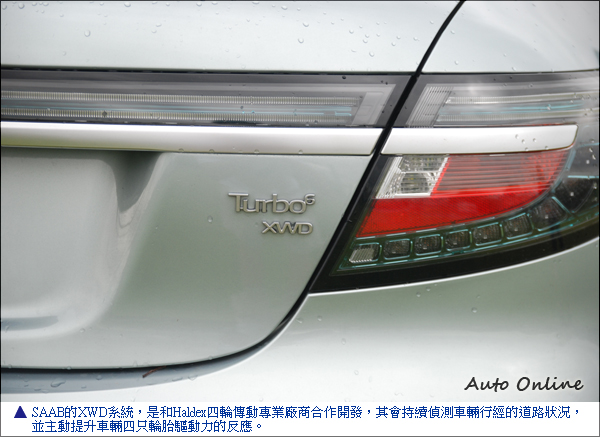 另外,Aero 2.8TS XWD上的SAAB XWD系統,乃是和Haldex四輪傳動專業廠商合作開發,其會持續偵測車輛行經的道路狀況,並主動提升車輛四只輪胎驅動力的反應。必要時可做大幅度的動力移轉,讓有較佳摩擦力的輪組獲得較大的驅動力量,維持Aero 2.8TS XWD的安全行車路線。