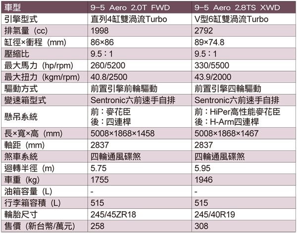 為何文前說到,沒能試駕到9-5 Aero 2.0T FWD和9-5 Aero 2.8TS XWD,是憾事一件?9-5 Aero 2.0T FWD、9-5 Aero 2.8TS XWD兩車均冠上Aero,在SAAB不成文的定義裡,唯有性能版本才會被賦予Aero的名號。9-5 Aero 2.0T FWD性能的確夠強,不過9-5 Aero 2.8TS XWD性能又更上層樓。