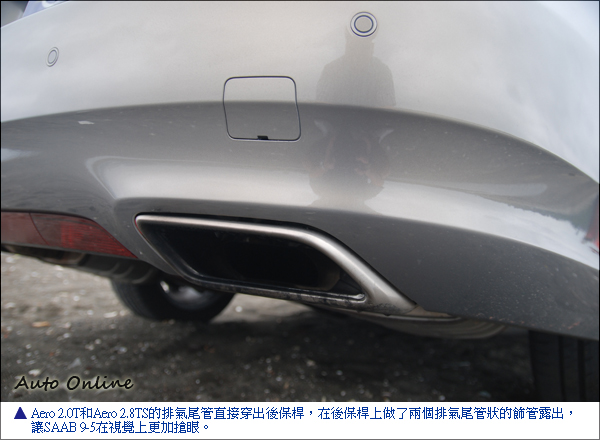 9-5 Aero 2.0T FWD和9-5 Aero 2.8TS XWD兩者間,配備幾乎一樣,但比之前試駕的Vector 2.0T要豪華許多。在外觀上,最大的不同處在於車尾排氣尾管的樣式。Vector 2.0T是採內置在後保桿之下,從外觀上並看不到排氣尾管的露出;而9-5 Aero 2.0T FWD和9-5 Aero 2.8TS XWD的排氣管,都直接穿出後保桿,且在後保桿上做了兩個排氣尾管狀的飾管露出,讓SAAB 9-5在視覺上更加搶眼。
