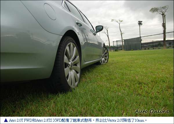 另外,從輪胎尺寸、輪圈的樣式,也可分辨出一點蛛絲馬跡。Vector 2.0T配的是225/55 R17的輪胎、8JX17五輻帶點旋風樣式的鋁圈。Aero 2.0T FWD配的則是245/45 ZR18輪胎、8JX18五輻式鋁圈。Aero 2.8TS XWD則搭配245/40 R19輪胎、8.5JX19的10輻式鋁圈。還有,Aero 2.0T FWD和Aero 2.8TS XWD配備了跑車式懸吊,所以比Vector 2.0T降低了10mm,看仔細一點,還是看得出這些差別的。