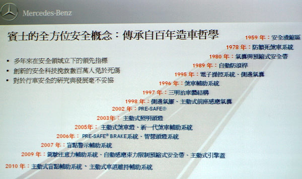 隨後由賓士所發明的重要科技,譬如防鎖死煞車系統(1978)、氣囊與預縮式安全帶(1980)、電子操控系統-側邊安全氣囊(1995)、煞車輔助系統(1996)、側邊氣囊與主動式前座感應氣囊(1998)、主動照明頭燈(2003)、主動式車道維持輔助系統(2010),如今都已落實推廣至全球各品牌的汽車上,在你我每天使用的汽車上,這些隱形的防護系統早就成為不可或缺的一部分。而在幾十年來的安全科技研發史中,其中在2002年開始提出的PRE SAFE概念更是徹底改變了新世代汽車安全科技的研發方向,堪稱是極為重要的里程碑。