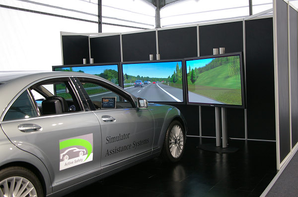 ▲透過動態駕駛模擬機台,座位上看出去的景象與一般行車環境無異,藉此試試賓士的各種安全系統反應。