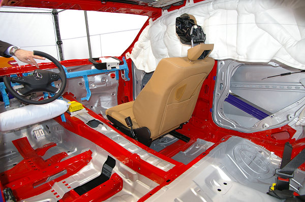 而在座椅內,也安裝了主動支撐的設計,在側撞時會快速地將手肘與肩部頂離車門50mm,盡量讓人體與車門間爭取更多的碰撞空間,根據研究,這可減少1/3傳遞至乘員軀幹上的撞擊力道。另外ESF 2009上的充氣式安全帶,也能讓後座乘客胸部獲得更好的保護,碰撞發生時,瞬間填充的氣體,讓脆弱的人體不再需要承受強大的安全帶拉力而受到二度傷害。