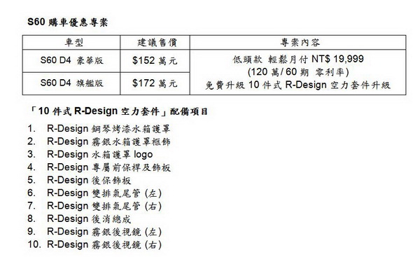 國際富豪汽車自2011年在競爭最激烈的中小型房車市場級距導入全新S60後,藉由優質的產品實力獲得消費者青睞,上市首年就熱銷千輛。為橫向強化產品陣線,國際富豪汽車於今年9月引進全新2.0升S60 D4柴油車型,邀請到新生代人氣影星彭于晏擔任S60 D4代言人,隨著最新電視廣告『Volvo S60 D4 - 跟你想的很不一樣』於國內強力放送。 VOLVO柴油引擎兼具高性能和高經濟性的優異特性更迅速引起年輕族群的熱烈討論和共鳴,全新13年式S60 D4甫上市一個月接單便突破150輛,帶動另一波銷售佳績,今年配額僅250輛的S60 D4預計在11月初就將完售,展現國際富豪汽車向來以創意取勝行銷策略的再次達陣。