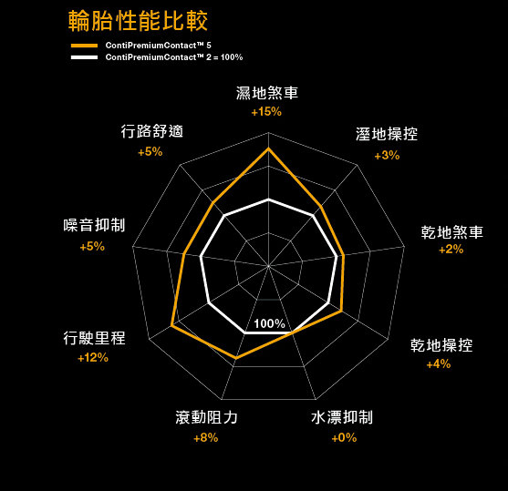 ContiPremiumContact 5![]() CPC5的胎塊及溝紋設計,強調結合CEC5與CSC5的舒適節能與操控性能,因此產品特色為具備頂尖的抓地力和操控性能,同時還能保有優異的駕馭感及極佳的舒適性,充份滿足追求性能表現和舒適的消費者需求。