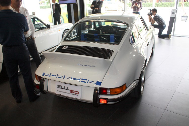經典蛙王911 Carrera RS 2.7(911)![]() 當天全場最受矚目的並非全新911(代號991),而是1963年的第一代911。這輛第一代911還不是普通版本,是1972年生產的911 Carrera RS 2.7,全球限量1,580輛,台灣目前只知道兩輛正品。911 Carrera RS 2.7有三種版本,分為賽道、運動以及豪華,不同版本在外觀與鋁圈會有不同顏色作區別。最大馬力210hp,搭配僅1,000kg的車重,以及獨特鴨尾造型尾翼,就算相隔40多年還是保有當年風範,聽說身價現值高達台幣1,500萬元。