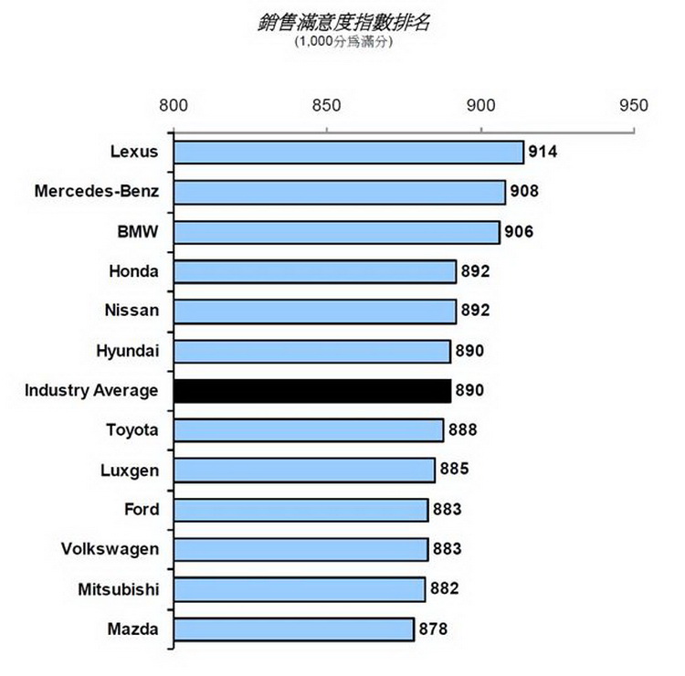 Nair表示:「新車買主熱切期待拿到新車,銷售人員應在新車移交的過程中給予車主足夠的時間,並詳盡回答他們的問題、解釋新車保固內容和回廠服務的條件,更需為顧客介紹客戶服務人員。交車過程並不只只是單純的買賣交易關係,更是銷售人員對車主傳達經銷商重視雙方關係的好時機。」 調查發現,購車和交車經驗的滿意度與顧客對經銷商與品牌的忠誠度與支持意願有密切關係。購車滿意度高 (台灣新車銷售滿意度調查得分958分或以上) 的車主,有62%表示「一定會」向親朋好友推薦他們購車的經銷商。反之,滿意度低 (台灣新車銷售滿意度調查得分838分或以下) 的車主,僅23%表示有意願向親朋好友推薦其購車經銷商。類似的趨勢同樣反映在新車車主推薦購車品牌的意願上。 Nair進一步指出:「經由口碑的推薦對經銷商吸引更多潛在新車買主到他們的展示中心看車大有幫助。調查指出,有78%的潛在新車買主對購買的品牌和車款的決定,主要參考親朋好友的意見。」 2013年台灣新車銷售滿意度調查包含了12個汽車品牌,凌志 (Lexus) 以914分總分拔得頭籌,連續第六年蟬聯台灣新車銷售滿意度調查冠軍。在7項評估要素中,凌志 (Lexus) 在銷售主動性、經銷商設備、書面作業 (手續辦理) 和交車程序均獲得最高分。而賓士 (Mercedes-Benz) 在銷售人員和交易條件兩項要素表現出色,以908分總分名列第二,BMW則以906總分排名第三。