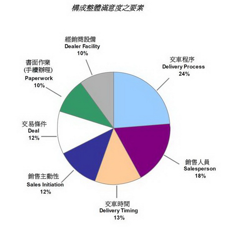 ![]() 台灣新車銷售滿意度調查至今已邁入第15年,這項調查以7項構成整體滿意度的關鍵要素來評估新車車主對銷售及交車經驗的滿意度。七項要素依重要性排序分別為:交車程序、銷售人員、交車時間、銷售主動性、交易條件、書面作業 (手續辦理) 和經銷商設備。台灣新車銷售滿意度調查的整體評分以1,000分滿分,分數越高則表示車主對新購車輛和交車過程的滿意度越高。在台灣新車市場,2013年的整體新車銷售滿意度平均為890分,與去年持平。