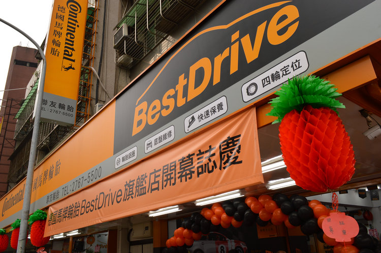 ![]() ▲許老闆經營輪胎產業有成,在當地享有高知名度與好口碑。聯通汽車的硬體規劃,承襲德國馬牌輪胎原廠最新企業識別設計,為了突顯其BestDrive旗艦店的定位,特別在橫式招牌中以突顯「BestDrive」新視覺讓往來人車對德國馬牌輪胎旗艦電流下深刻印象。 ![]() ▲店招特別加入BestDrive商標,以突顯旗艦店的定位。![]() ▲雙店面的格局,並具備足夠的維修機台與車位,讓顧客不需等待過久。
